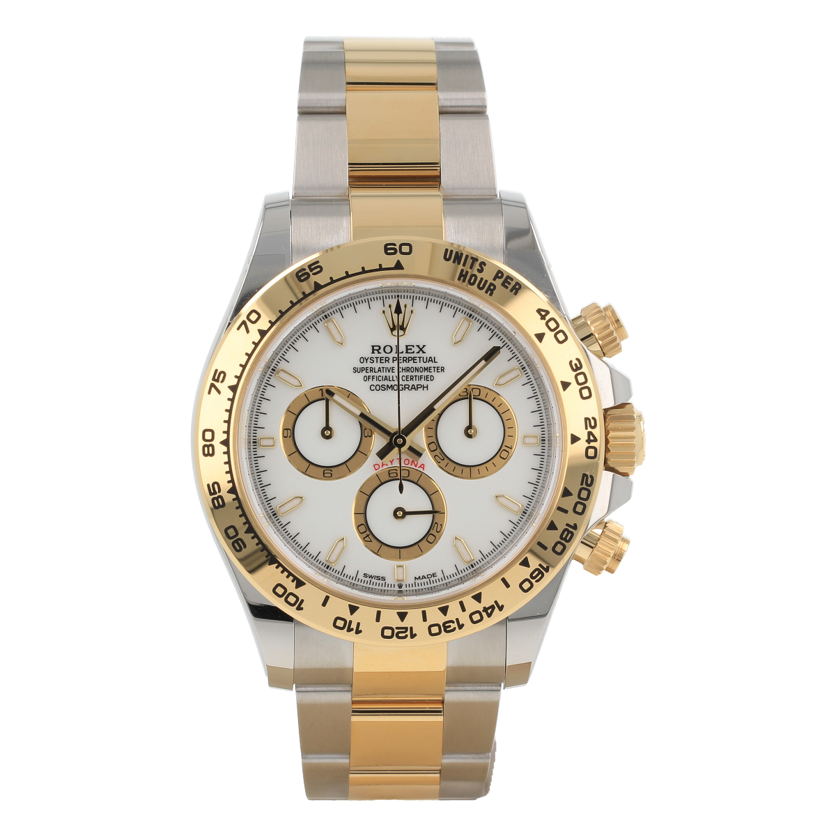 La caja de 40 mm en acero Oystersteel y oro amarillo combina resistencia y lujo, con acabados pulidos y satinados que realzan su carácter elegante y deportivo. El bisel fijo de oro amarillo con escala taquimétrica grabada refuerza la identidad del Daytona, diseñado originalmente para medir velocidades con precisión en las pistas de competición.